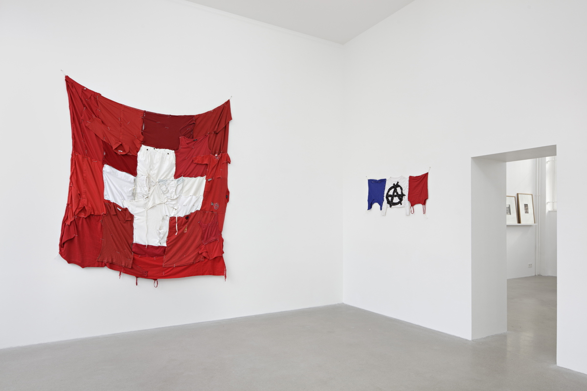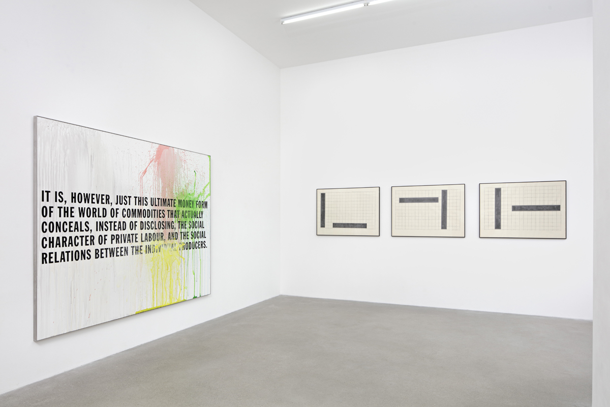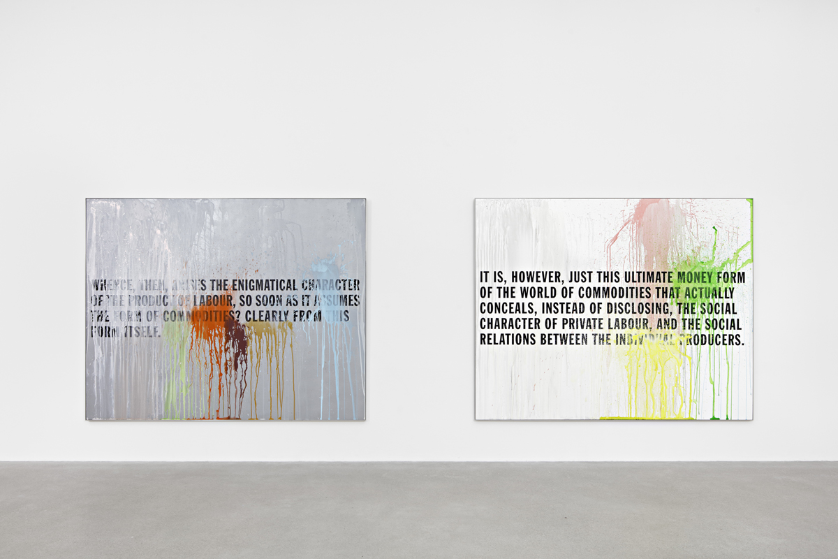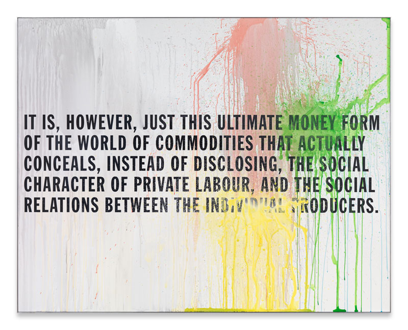 Andere Arbeiten setzen Zitate unterschiedlicher Autoren in großen Blockbuchstaben ins Bild, „kommentiert“ durch Farbbeutel, die auf der Bildoberfläche zersprungen sind. Die Zitate sind gelegentlich Klassikern der marxistischen Wirtschaftstheorie entnommen, wie z. B. Karl Marx oder Alfred Sohn-Rethel, oder offiziellen Dokumenten, wie z. B. der UNO-Konvention gegen Folter.[2] Exemplarisch ist die Serie „Marx-Arbeiten“ mit Textfragmenten aus Das Kapital von Karl Marx.