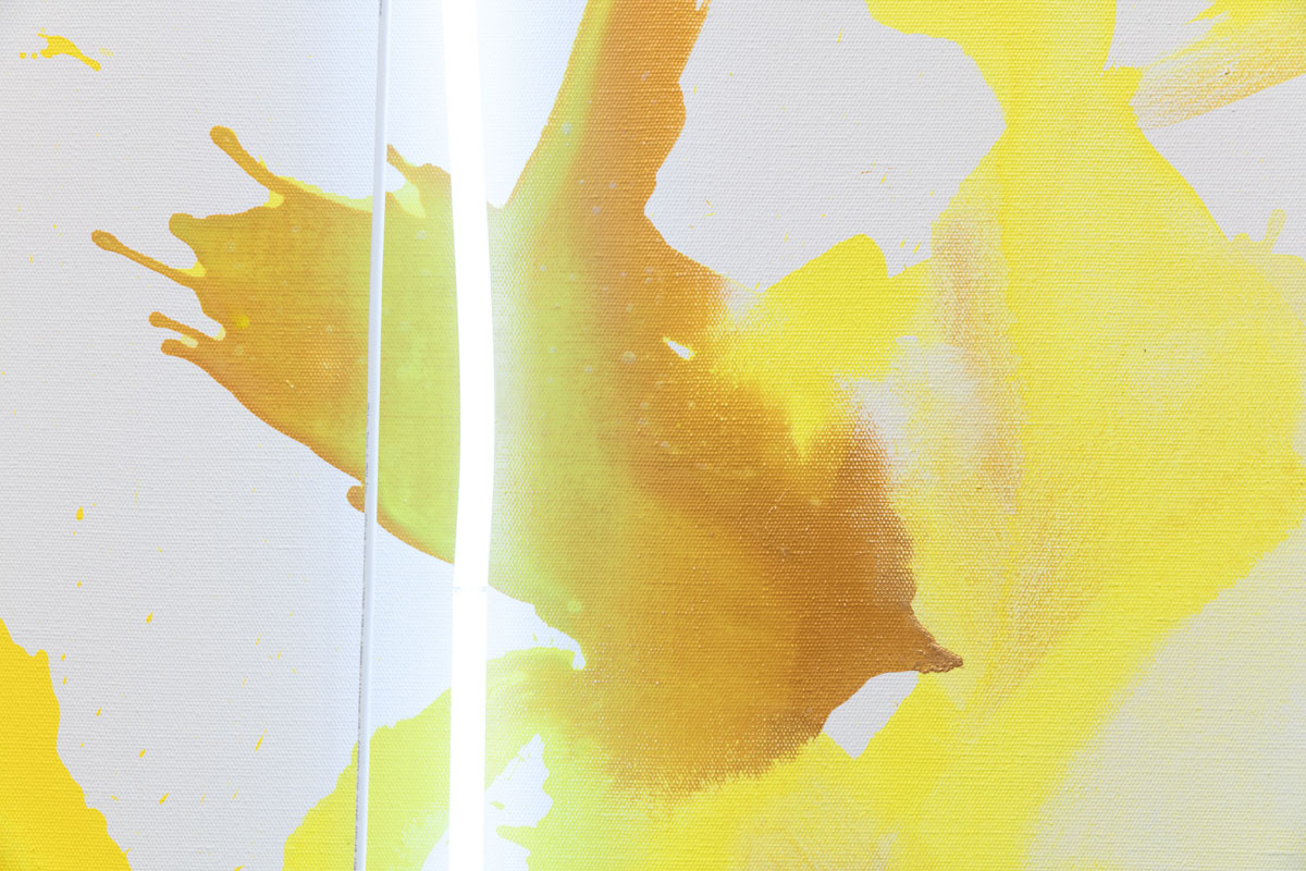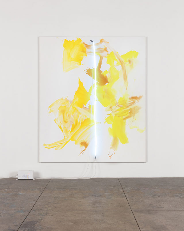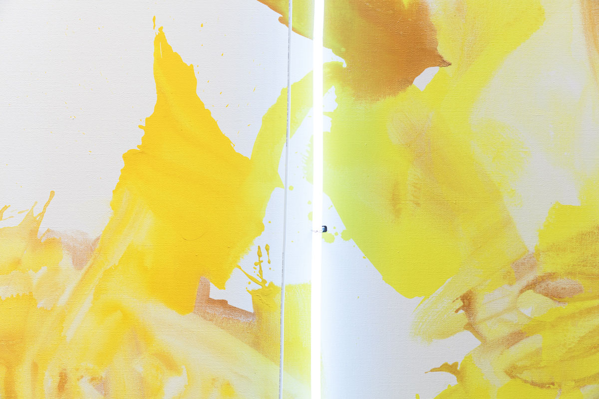 Mary Weatherford, "Canaries", 2017, Flashe and neon on linen, 93 x 79 x 3 inches ( 236,2 x 200,7 x 7,6 cm) (Detail)