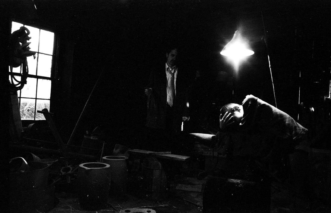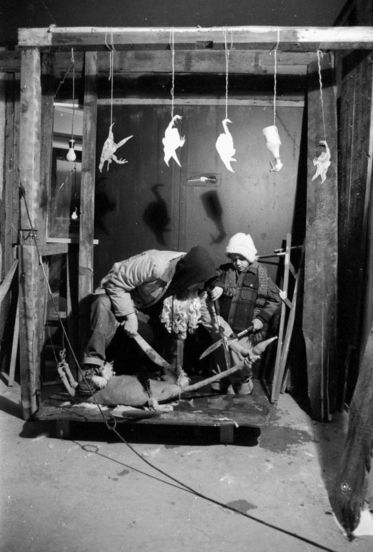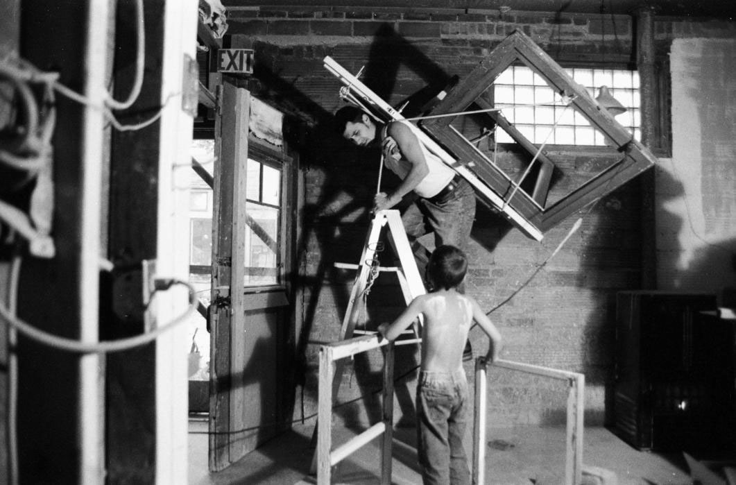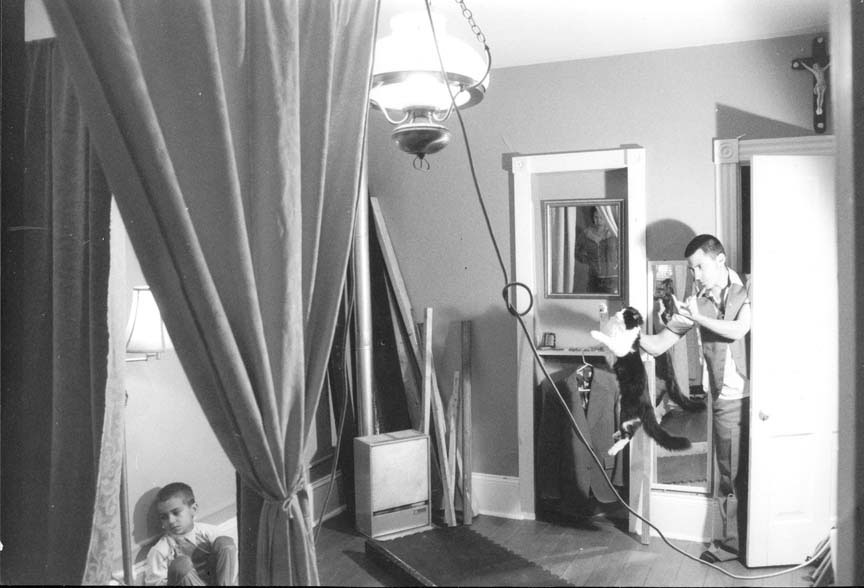 My artistic process starts with a staged scene in my studio or a site-specific location with whatever materials or found objects I need to complete the idea. In all my photo or video-installations, I strive to achieve an underlying seriousness to subjects of family dynamics-- specifically my relationship with my four sons, identity, religion, and social class through absurdities and satire. I include my family as the immediate subjects in the performance, since the staged events are filled with metaphorical reverberations of lived history and experience. My children’s central role in the work serves as an identifiable entry point for the audience. Whether I choose to build a constructed scene or find an existing space, each scene that I create is a unique frame within a larger story. The positioning of the figures and objects, as well as the lighting, change until the scene is visually and conceptually how I want the work to be perceived by the viewer. My work often displays a sharp contrast in order to produce a sensation that makes the viewer both familiar and uneasy. When asked about the irregularity of the margins in my work, I explain that there is a relationship between the apparent contempt for the materials and the reverence for the subjects of the imagery. I have always said that the subject is the most important part of my work. I understand that for people from photography backgrounds the technique of my work is very distracting to the content. My work is all about metaphor. The rough edges, irregular margins, erratic fixer stains, and haphazard tonal range are suggestive of the working-class way of life that my grandfather experienced when he came to America as an Italian immigrant. This set of values was passed down to my father and then to me in all of its eccentricities. Technically, I could print what photographers would consider to be a perfect picture, but I would consider that to be imperfect. The seeming imperfections that you see on the physical print are similar to ways that I use the materials within the photograph. The props or devices I include in the images are made of paper, wood, tape and clay---simply because they are all mediums that are all disposable or re-usable. I have decided that it is more important for me to be myself and approach techniques and materials the way I do rather than jeopardize the integrity of my art by conforming to existing standards.